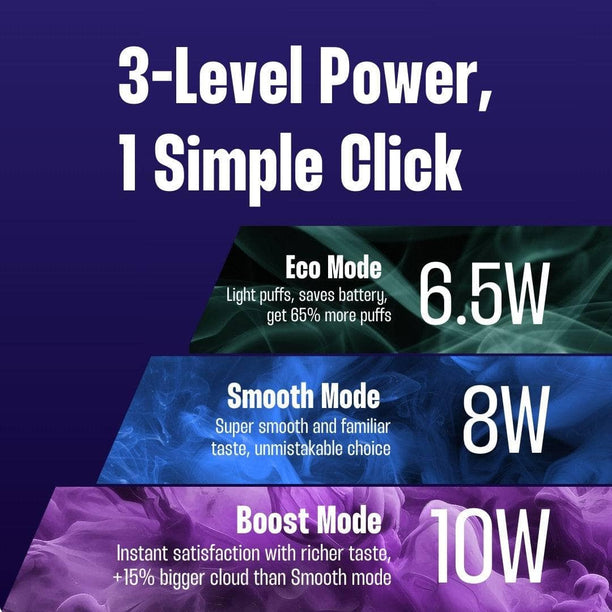 Ben je op zoek naar een veelzijdige vape? Dan ben je hier aan het juiste adres. Met een instelbaar vermogen en drie verschillende modi zijn de mogelijkheden eindeloos. Kies de Eco-modus om de batterij te sparen met lichtere trekjes, geniet van de Smooth-modus voor een vertrouwde, zachte smaak, of verhoog je ervaring met de Boost-modus voor een intensere smaak en tot 15% meer damp dan de Smooth-modus. Met deze verschillende modi kun je je vape-ervaring personaliseren, moeiteloos aanpassen aan elke gebruiker en diens omstandigheden, en gemakkelijk integreren in je routine.